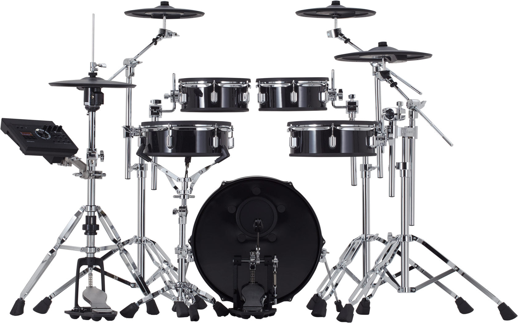 - 省空間的 V-Drums Acoustic Design 套鼓,具有淺鼓身鼓殼和和升級的雙支撐鍍鉻鼓架s