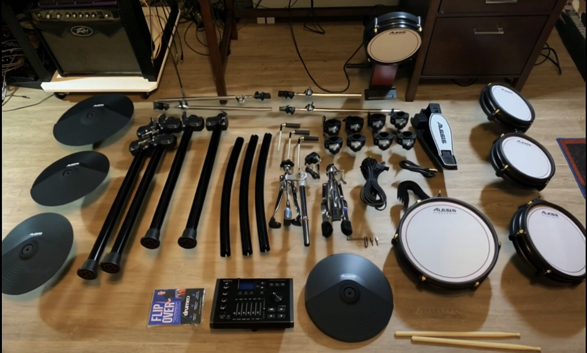 8” kick, a 12” dual-zone snare, two 8” dual-zone rack toms, and a 10” dual-zone floor tom, (Patent #US 9,424,827 B2) along with a 12” hi-hat with control pedal, two 12” crashes with choke, and a 14” triple-zone ride
