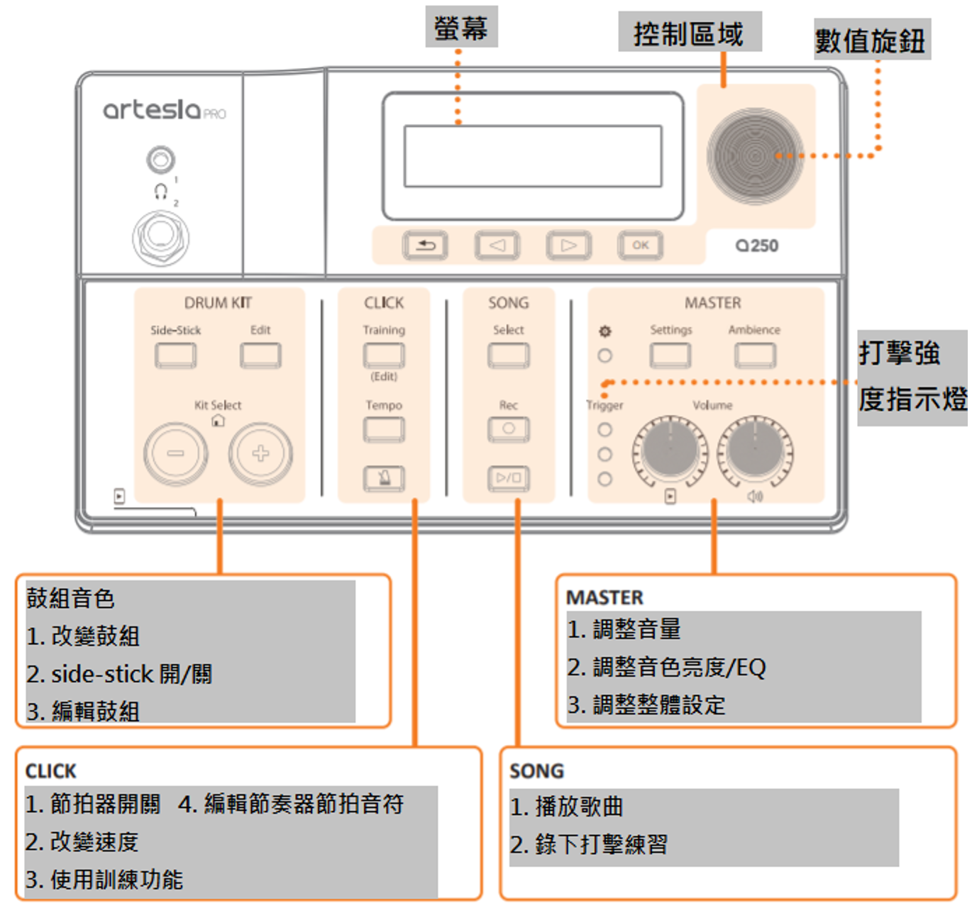 簡單直觀的操作 -全新設計的鼓音源機,操作簡單,功能面板直覺操作。完整鼓組幾乎無須再擴充。